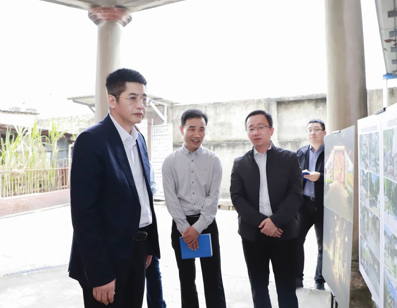 高金全走进项目建设工作专班,对照规划设计图板听介绍,登高远眺社区田园风光全貌,详细了解整体规划布局与建设发展方向,深入古榕树、旧礼堂、华侨故居等重点点位,实地察看道路交通优化、房屋风貌提升、古树名木保护及历史建筑活化利用等推进情况,协调解决实际困难。
