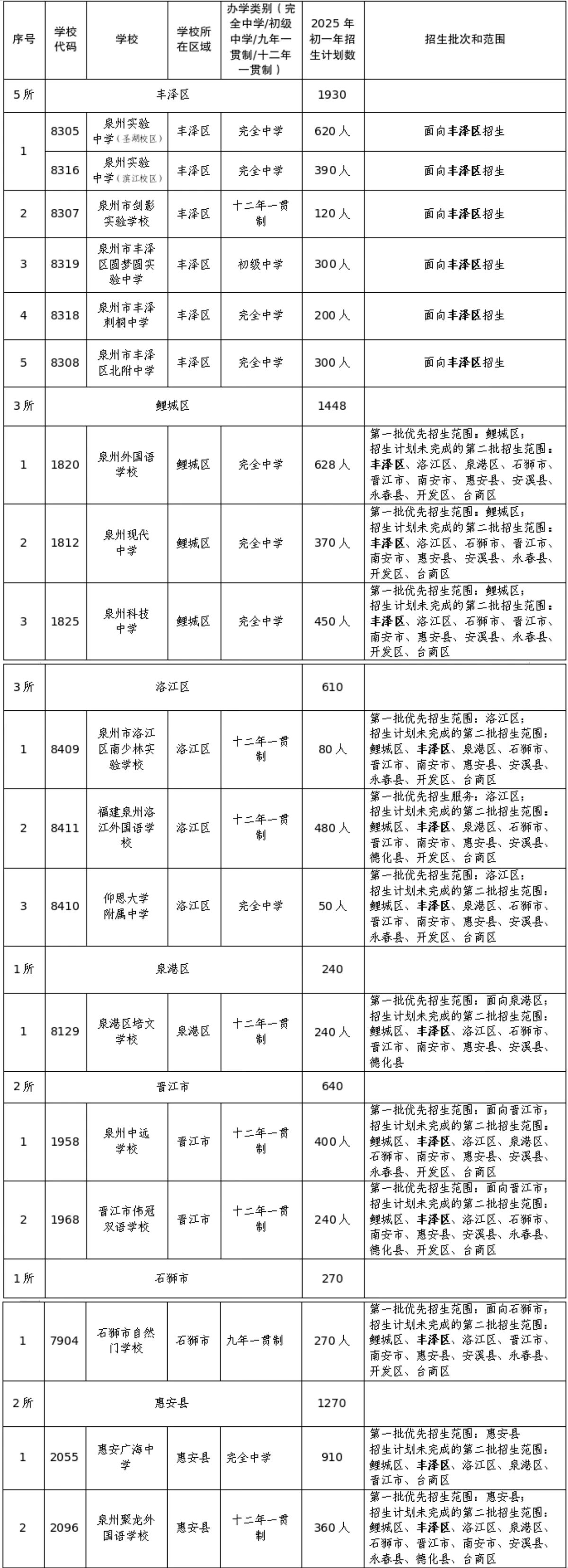 8.2025年全市民办初中学校各批次的招生电脑随机派位录取工作统一由泉州市教育局负责牵头组织。录取具体步骤与志愿填报见《2025年泉州市民办初中学校招生工作服务指南》(附件2)。