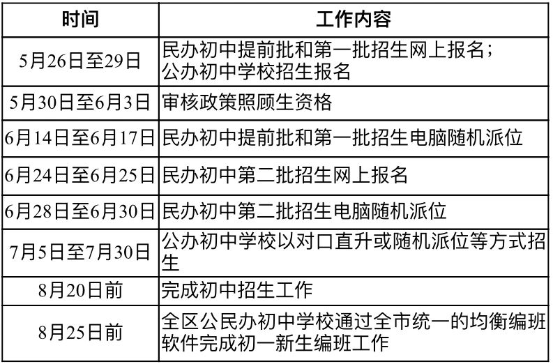 4.7月8日至9日,我区户籍且符合户籍迁入时间、住房产权规定要求的小学毕业生(扣除已被民办初中及市直公办初中电脑派位录取的),按区属各公办初中学校的招生范围,对口直升安排入学,由被录取初中学校通知办理入学注册手续。我区户籍但无符合户籍迁入时间、住房产权规定要求的小学毕业生(扣除已被民办初中及市直公办初中电脑派位录取的),经区教育局统筹安排,由被录取初中学校通知办理入学注册手续。
